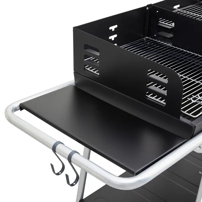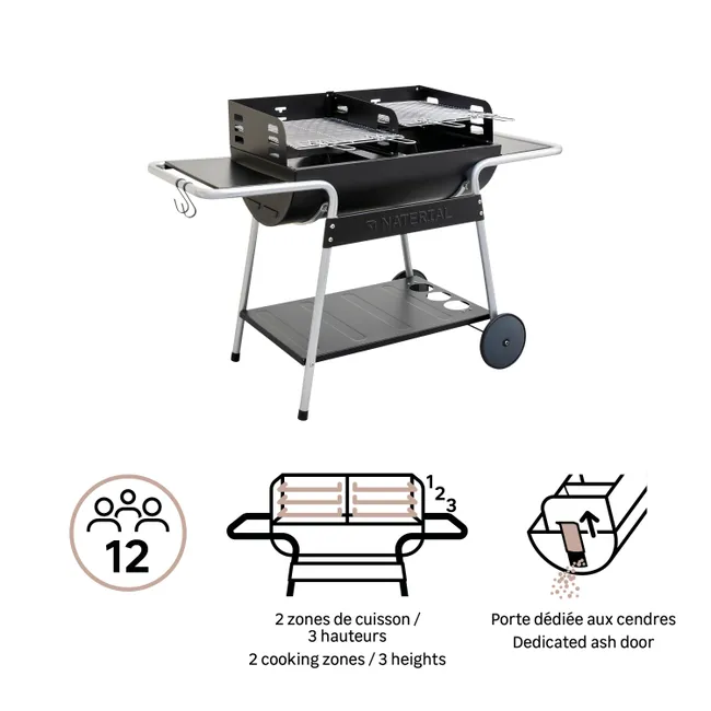 Cerchi il barbecue a carbonella perfetto per il tuo patio? Il barbecue a carbonella Darius è il tuo alleato! Piatti caldi adatti a tutti i tipi di spazio. È adatto sia a piccole terrazze che a giardini spaziosi. Quando arrivano le giornate di sole, condividi un pasto festivo per 6 persone con ricette insolite. Delizia i tuoi ospiti con spiedini di zucchine al pesto di basilico o Camembert al forno. Per garantire che il barbecue raggiunga la temperatura ideale, la sua area di cottura è dotata di una griglia per regolare l’altezza di cottura. Vantaggi tecnici: il pannello laterale e i ganci consentono di appoggiare i piatti e tenere gli utensili a portata di mano. Un pannello inferiore è dedicato allo stoccaggio della carbonella. Consigli per la manutenzione: Darius si pulisce facilmente con un panno umido e un sapone delicato. Grazie al suo focolare in ghisa, offre una vera e propria durata al tuo barbecue. Si consiglia di riporre il barbecue per l’inverno sotto una copertura (non inclusa) per evitare che sia danneggiato dalle condizioni meteorologiche esterne.
